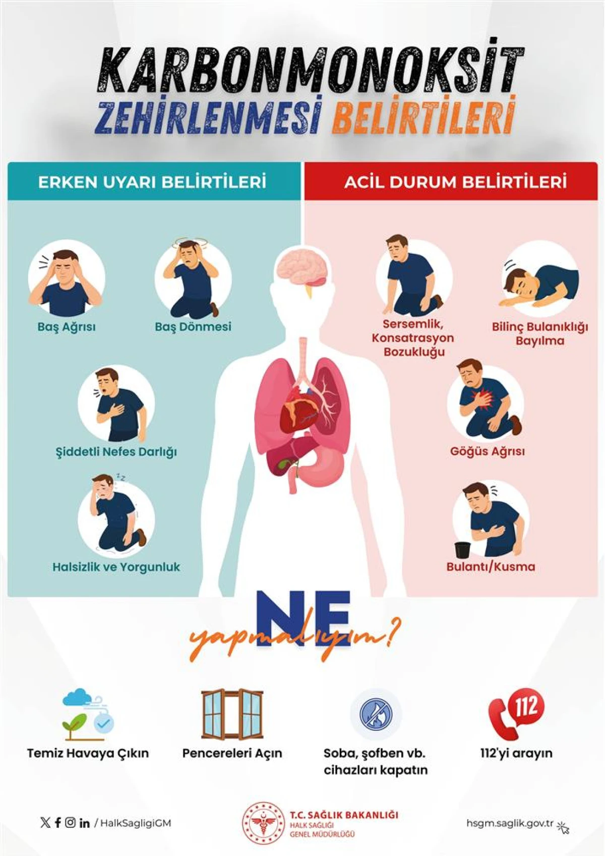 Karbonmonoksit zehirlenmelerinde ilk belirti baş ağrısı olduğundan şofben, kombi, jeneratör, soba, mangal vb. olan kapalı bir alanda baş ağrısı başladığında hemen pencereler açılmalı, ortam havalandırılmalı ve temiz havaya çıkılmalıdır. Karbonmonoksit zehirlenmesinden kuşkulanılırsa belirti olmasa bile hasta hemen açık havaya çıkarılarak 112 Acil Çağrı Merkezi aranmalıdır”