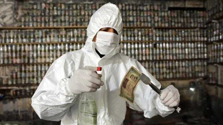 Koruyucu tulum giyip, maske ve eldiven takan Esat Kaplan, cımbız ile paraları tek tek cam fanusun içerisindeki dezenfekte ilacında bir süre bekletti ve ardından kavanozlara yerleştirdi.