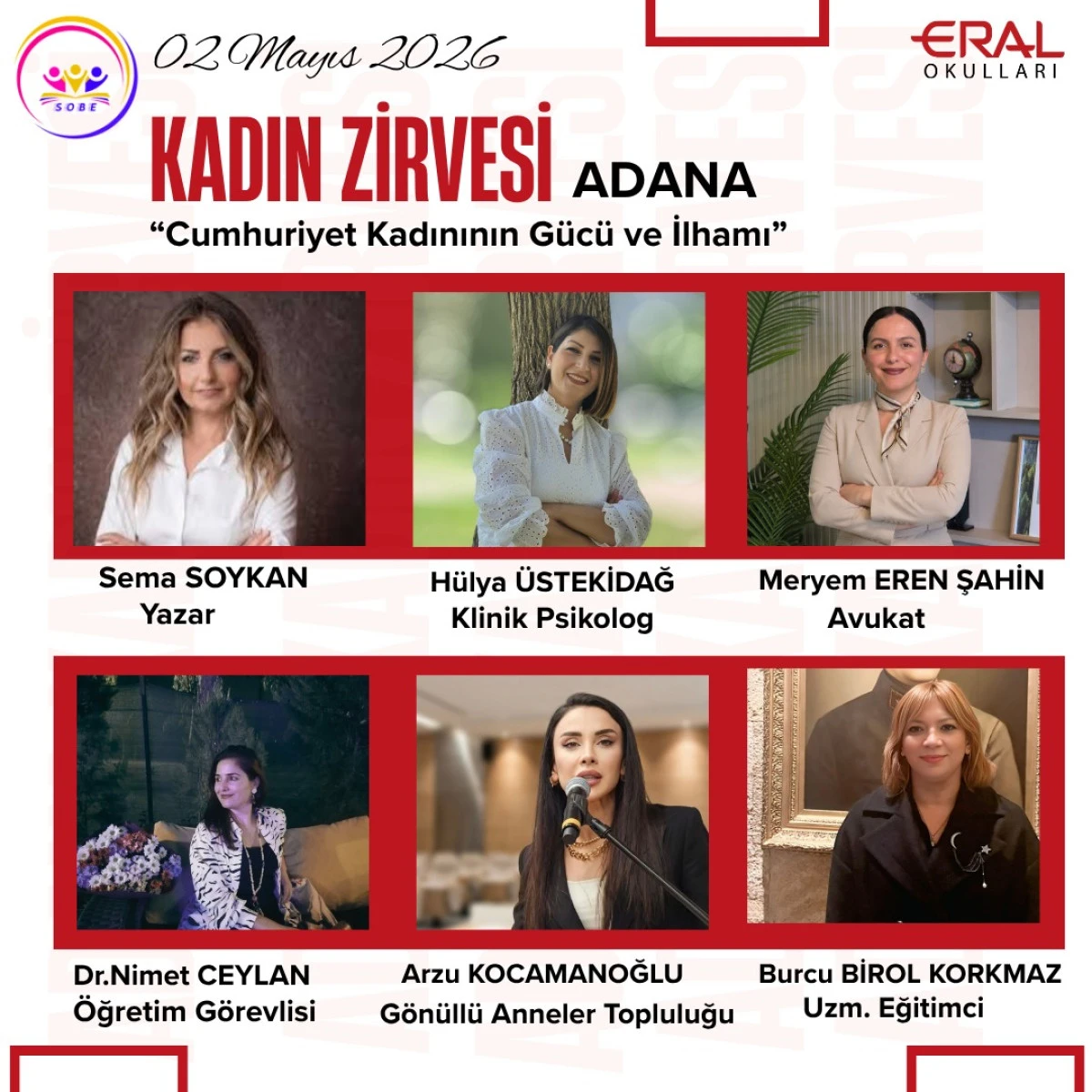 Sobe Adana, 2 Mayıs Cumartesi günü Eral Okulları’nda bir “kadın zirvesi” düzenleyecek. “Cumhuriyet Kadınının Gücü ve İlhamı” temasıyla gerçekleştirilecek zirvede, "Kadının Cumhuriyetteki Yeri", "Haklarını Bilen Kadın, Kaderini Yazar" ve "Dengede Kadın: Kariyer, Aile ve Ben" ,Geçmişten bugüne Kadın Manzaraları gibi kritik başlıklar uzman isimler tarafından tartışılacak.