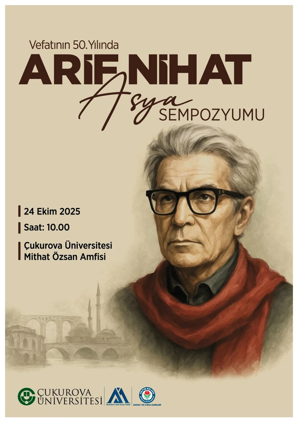 Mehmet Akif İnan Vakfı himayesinde; Eğitim-Bir-Sen Adana 1 ve 2 No’lu Şubeleri ile Çukurova Üniversitesi tarafından düzenlenecek olan; “Vefatının 50. Yılında Arif Nihat Asya Sempozyumu” 24 Ekim Cuma günü Çukurova Üniversitesi saat 10’da Mithat Özsan Amfisi’nde gerçekleştirilecek ve gün boyu devam edecek. Memur-Sen ve Eğitim-Bir-Sen Genel Başkanı Ali Yalçın’ın da katılması beklenen sempozyum, Arif Nihat Asya’nın şiir ve nesir dünyasını akademik bir zeminde ele alacak.