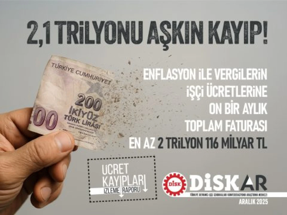 Enflasyon ve vergilerin işçi ücretlerine 11 aylık toplam faturasının en az 2 trilyon 116 milyar lira olduğu belirtildi. Aralık 2025 “Ücret Kayıpları İzleme” raporunu açıklayan DİSK-AR’ın hesaplamasına göre, bu yılın Aralık ayında ortalama ücretin yarısından fazlası vergi, kesinti ve enflasyon nedeniyle gitti. 11 ayda enflasyonun işçi ücretlerine birikimli faturasının 1,2 trilyon lira olduğu savunulan raporda, “Asgari ücrete ara zam yapılmaması kayıpları büyüttü. Kasım 2025’te asgari ücretin enflasyon karşısındaki kaybı en az 6 bin 574 lira oldu. Yılın 11 ayında ortalama işçi ücretinin birikimli vergi ve enflasyon kaybı 124 bin 835 lira” denildi.